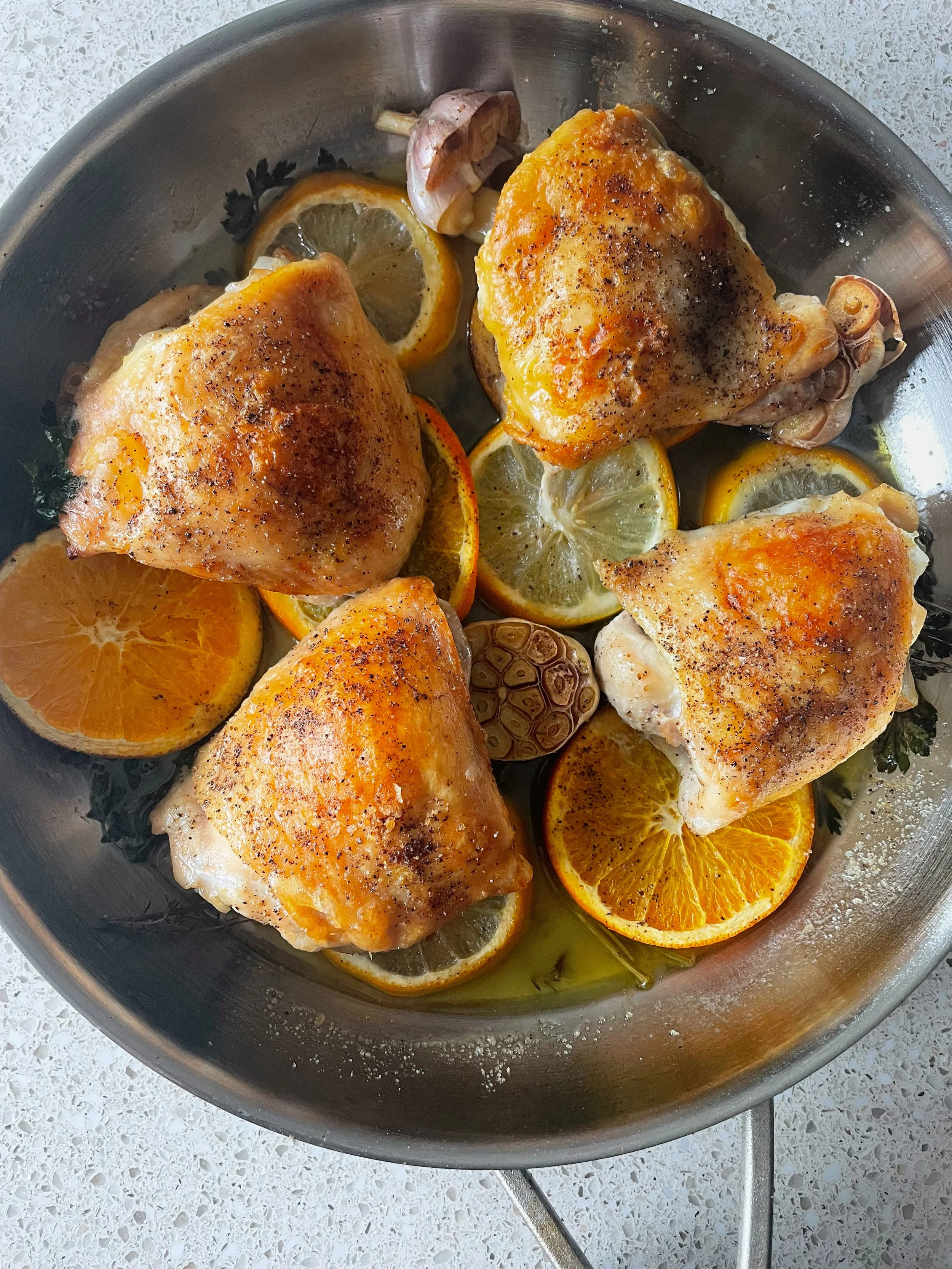 Preheat your oven to 425F with the rack in the middle. In a large, oven-safe skillet, add in the parsley, thyme, orange slices, lemon slices, and garlic to make a nice bed for the chicken. Drizzle the aromatics with a tablespoon or so of oil. Take the chicken thighs, and season generously with salt and pepper, and drizzle with oil. Place on the bed of aromatics with the skin side up. Bake until the internal temp is 165F, about 35-40 minutes. Discard the aromatics and reserve the pan sauce. Serve the chicken with the pan sauce.
